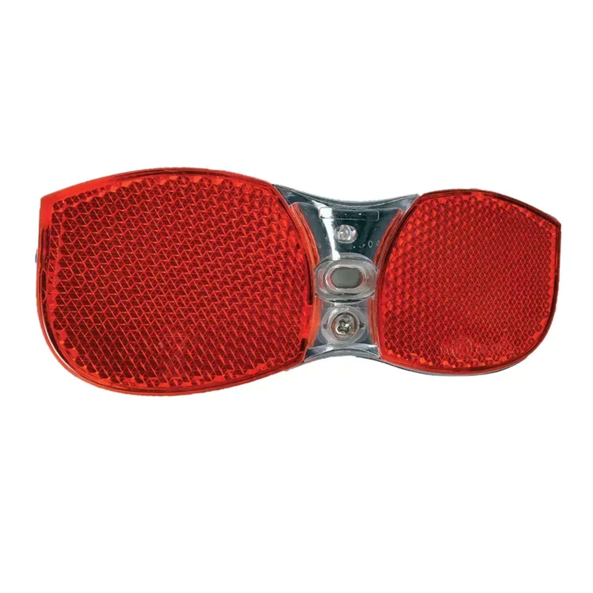 This tail light features a durable, water-resistant construction and is suitable for racks with 80mm mounting points. It provides 270° visibility and includes an integrated reflector for enhanced safety.